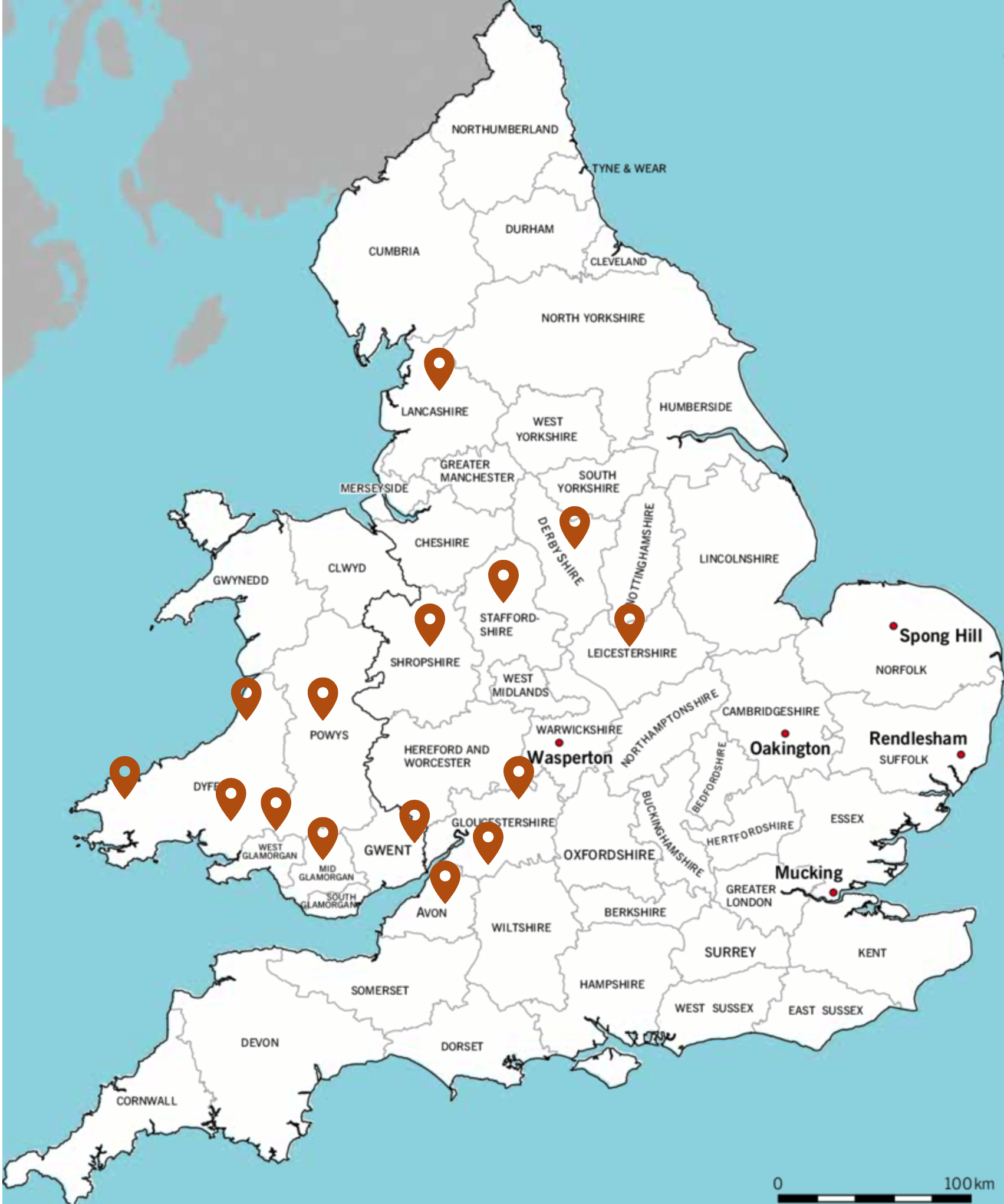 Bridgend • Cardiff • Carmarthenshire • Ceredigion • Conwy • Denbighshire • Derbyshire • East Devon • Flintshire • Lancashire • Leicester • Merthyr • Monmouthshire • Neath Port Talbot • North Lincolnshire • Pembrokeshire • Powys • Shropshire • Vale of Glamorgan • Wolverhampton